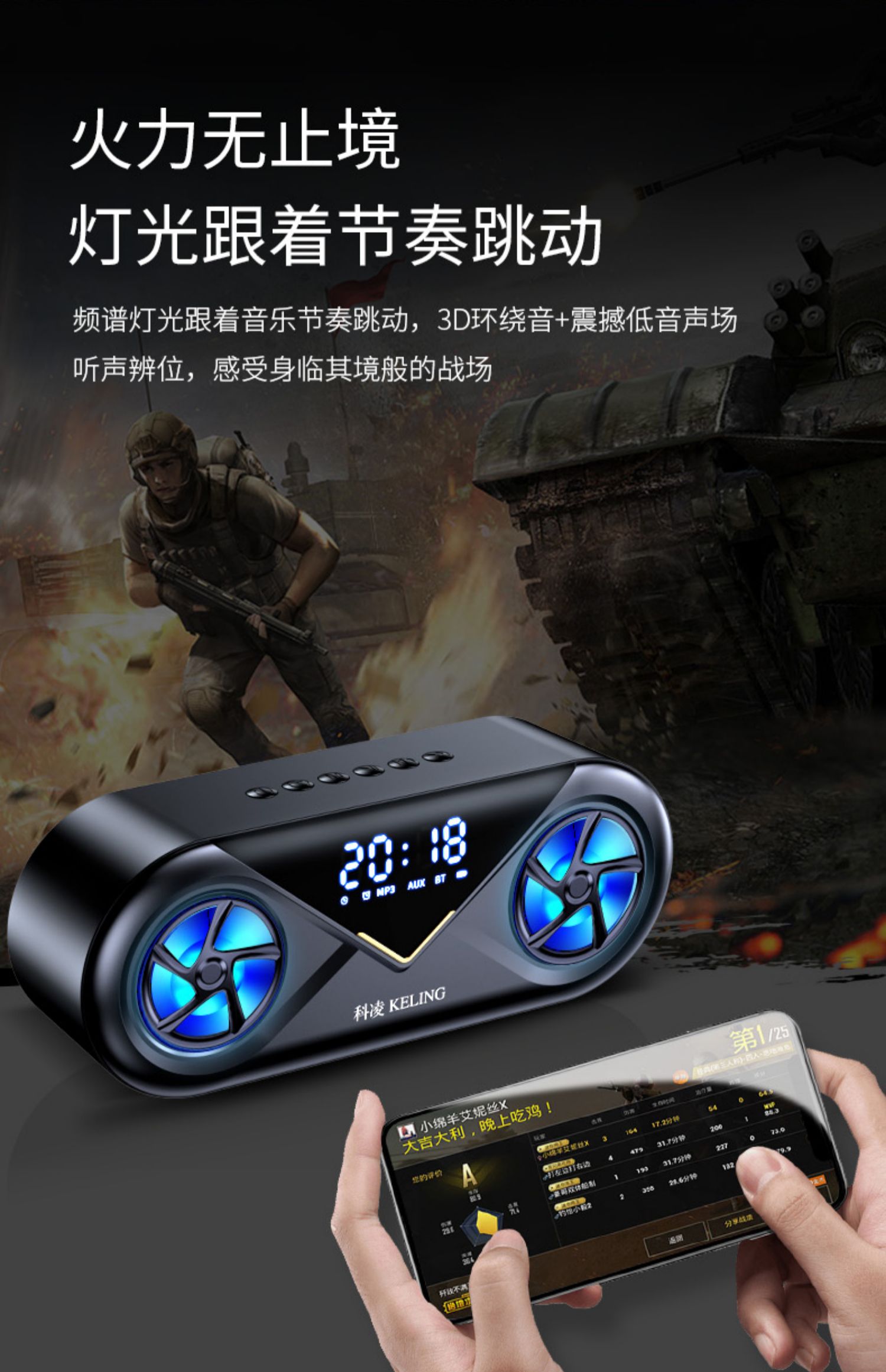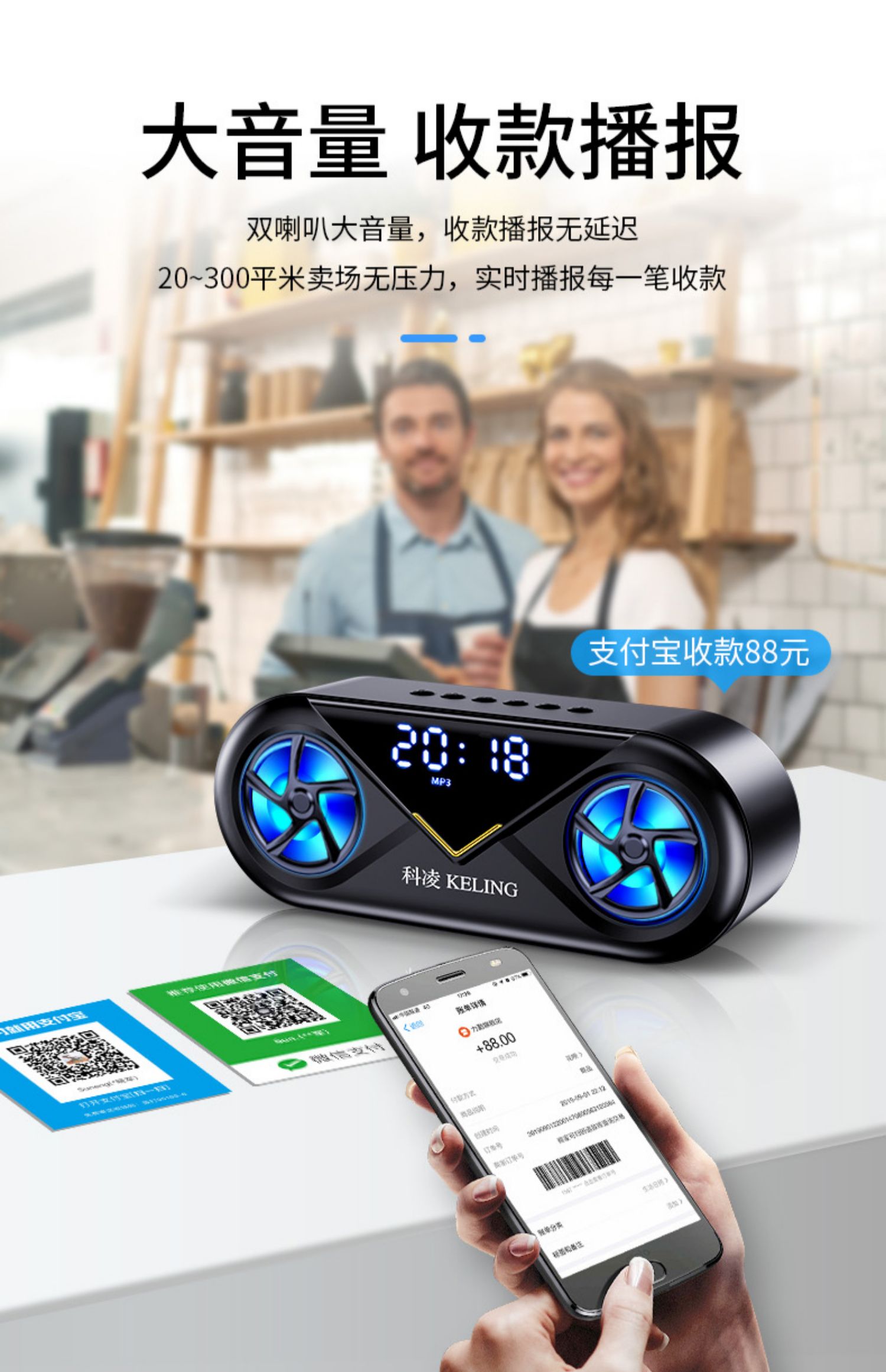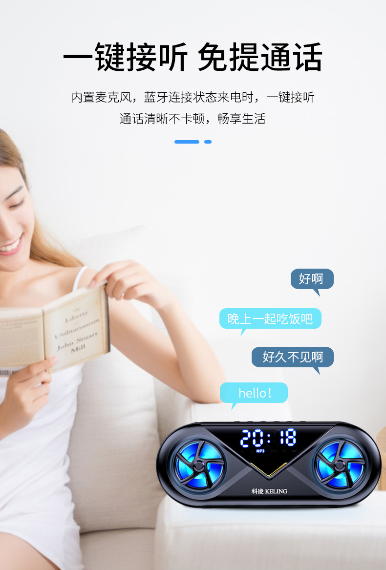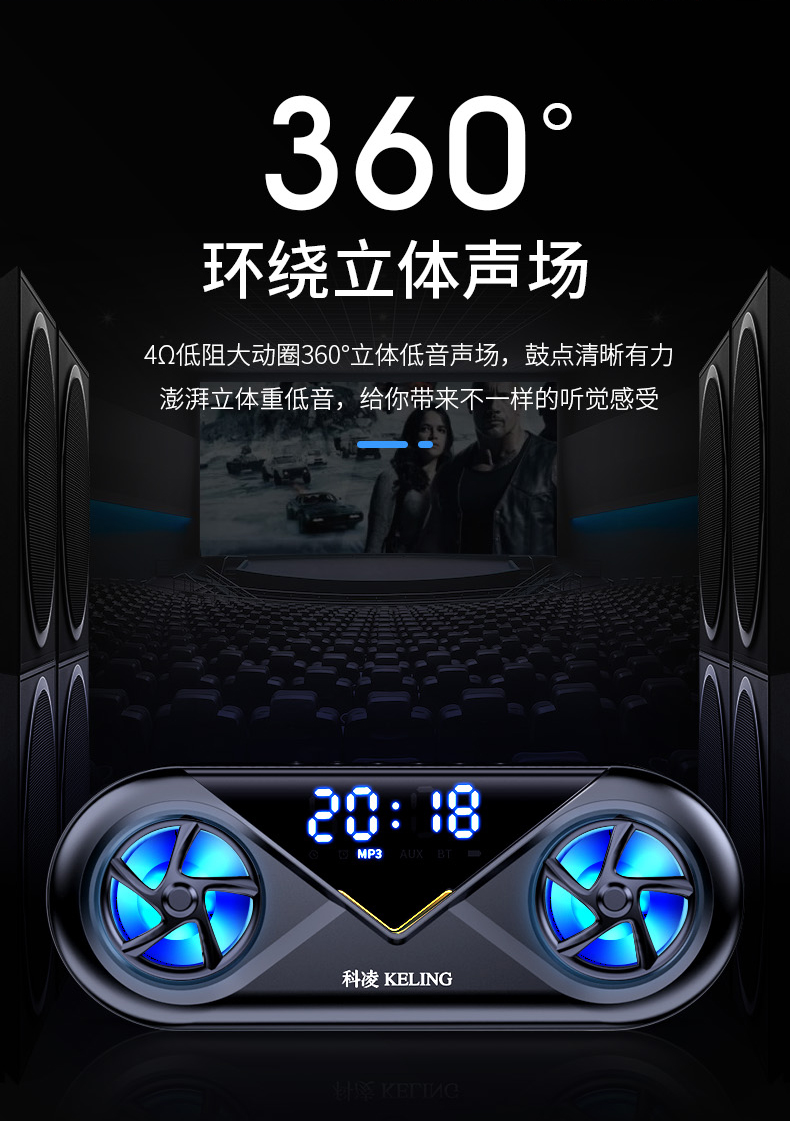 • 商品名称:科凌无线蓝牙音箱双喇叭大音量3D环绕家用闹钟小型迷你音响手机超重低音炮便携式户外车载收款收钱语音播报器