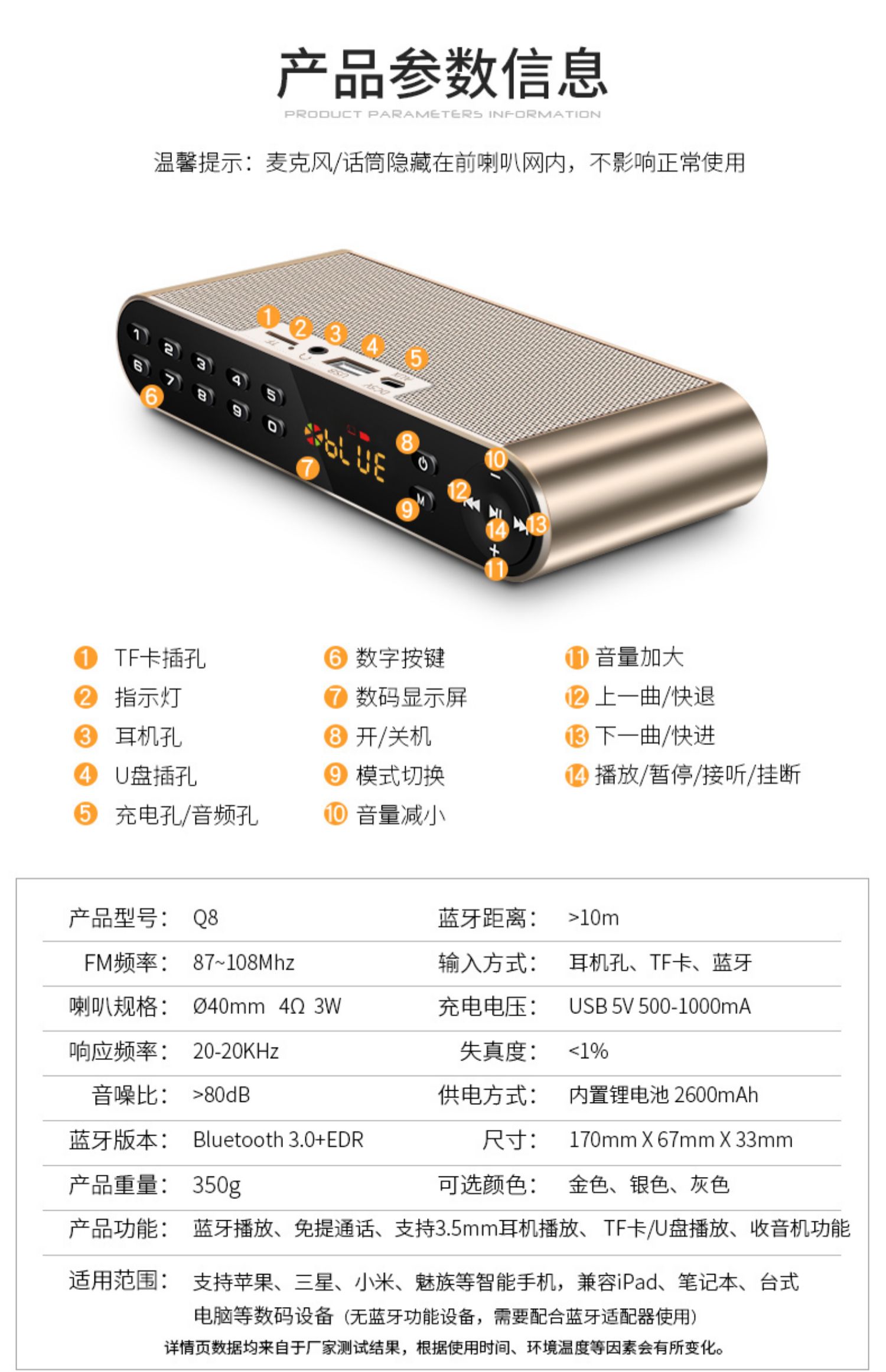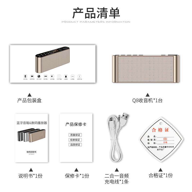 • 商品名称:科凌Q8双喇叭蓝牙音箱无线手机迷你3D音响户外大音量收音机便携式插卡U盘小型家用低音炮一体多功能收钱播报