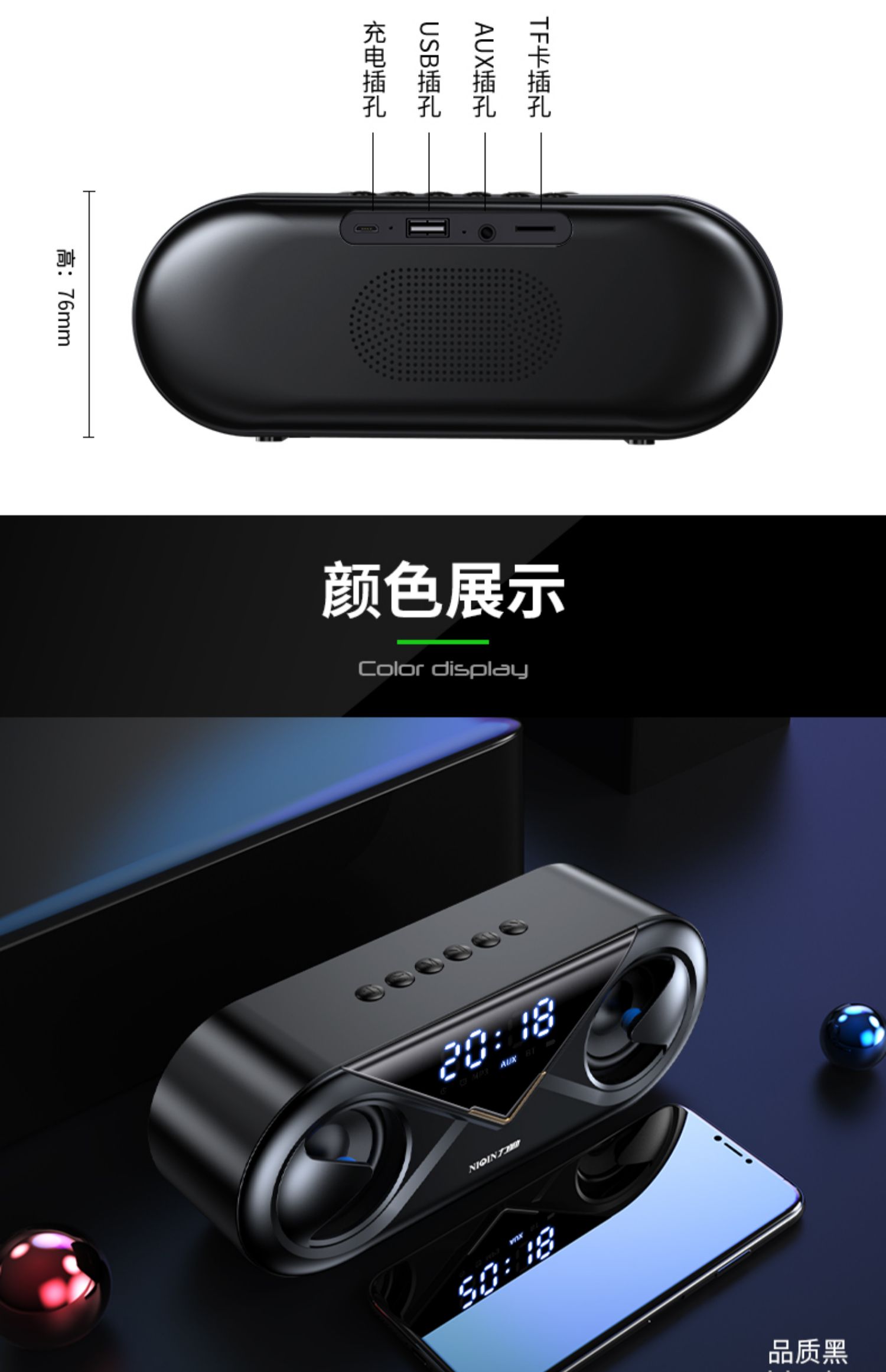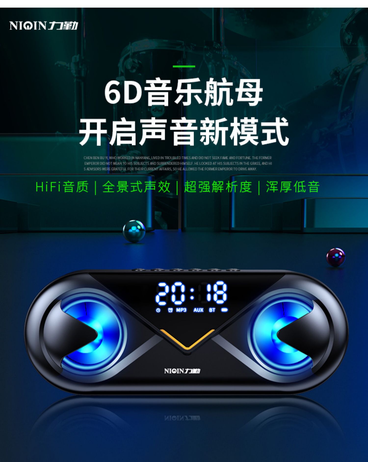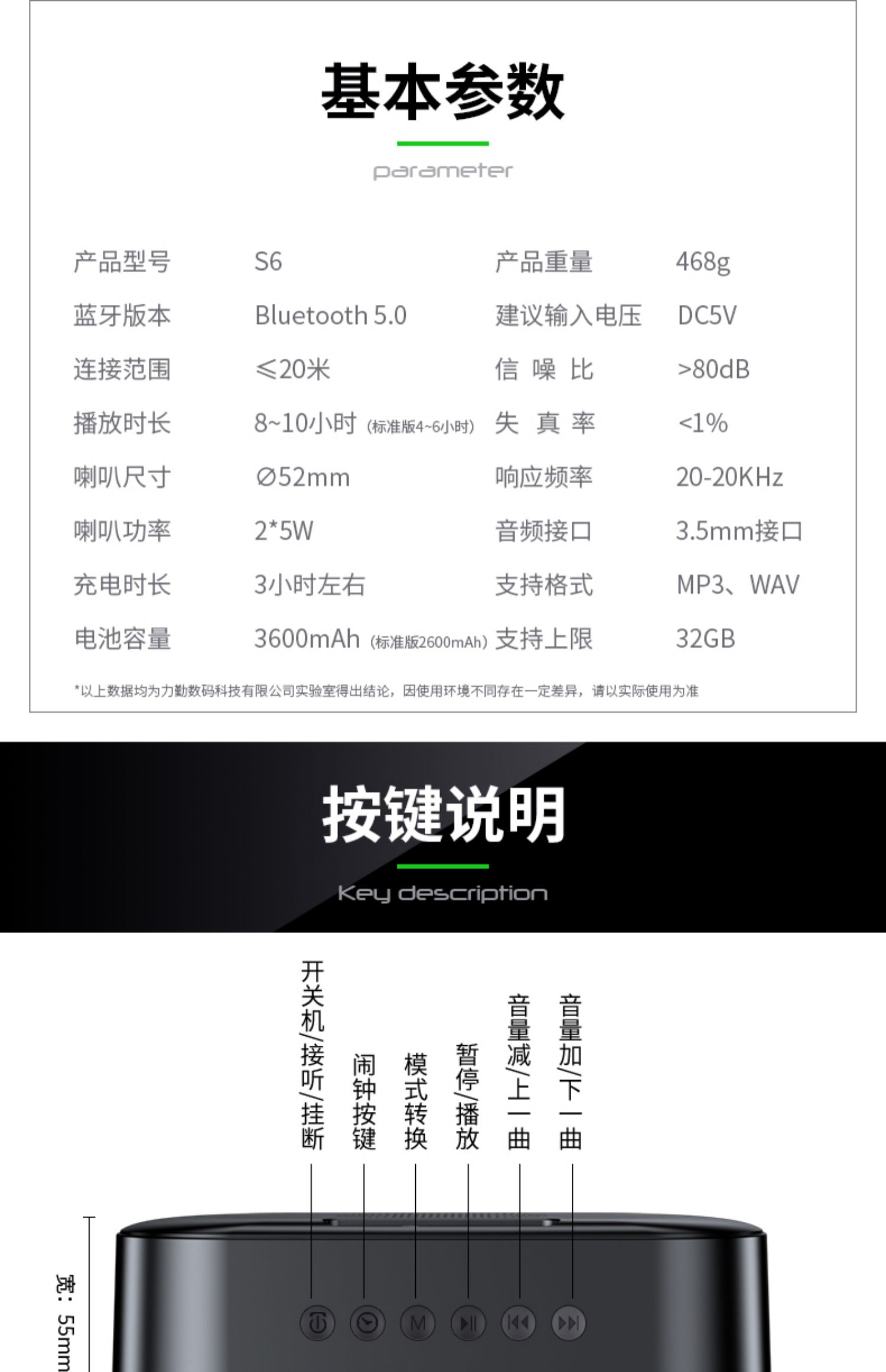 • 商品名称:力勤S6 无线蓝牙音箱大音量3d环绕超重低音炮家用闹钟随身小型音响便携式微信收款收钱提示喇叭u盘数码播放器