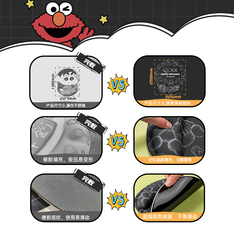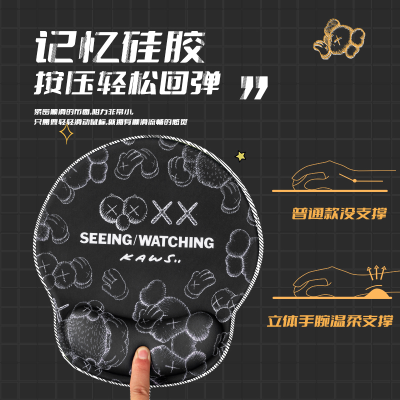 • 商品名称:芝麻街kaws鼠标垫护腕创意男生卡通硅胶加大舒适软垫3d胸手托加厚游戏电脑办公可爱女ins风小号手腕垫滑鼠垫