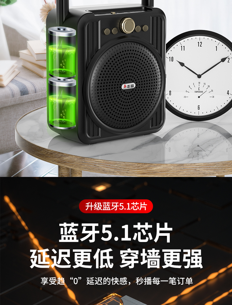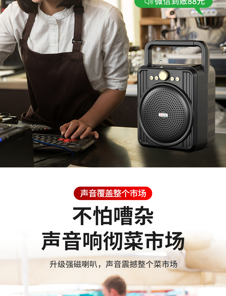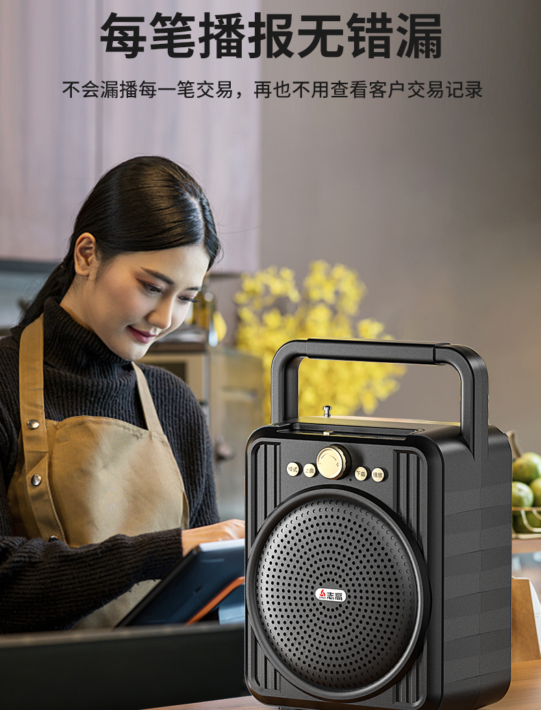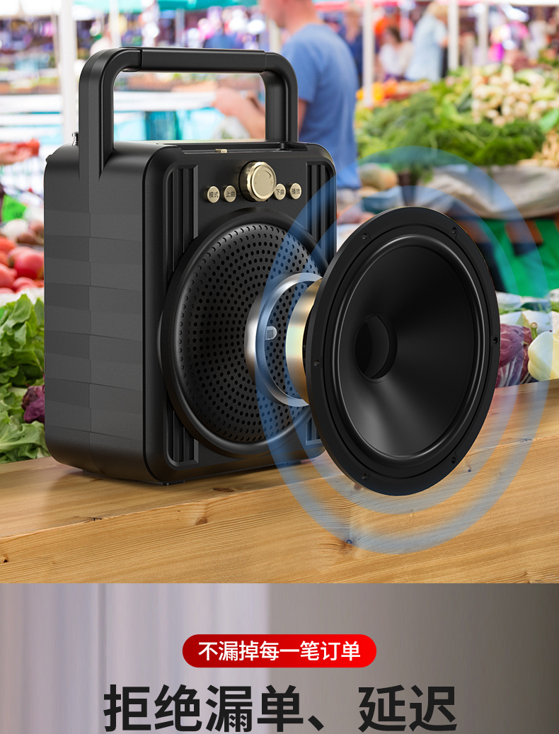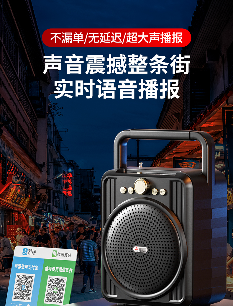 • 商品名称:菜市场店铺户外收款音响支付宝双喇叭大音量微信二维码收钱付款专用语音播报神器商家用无线蓝牙小型音箱志高