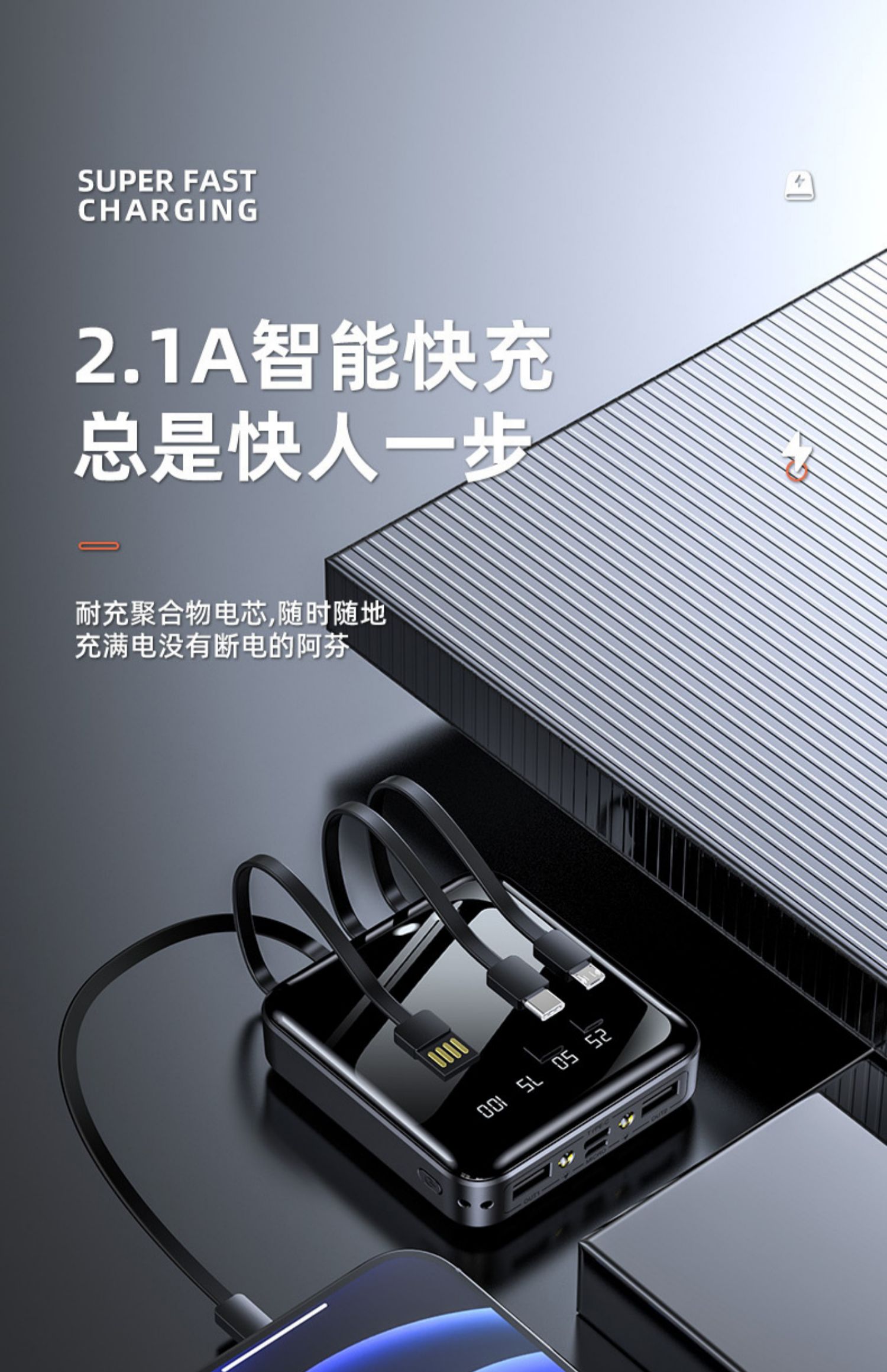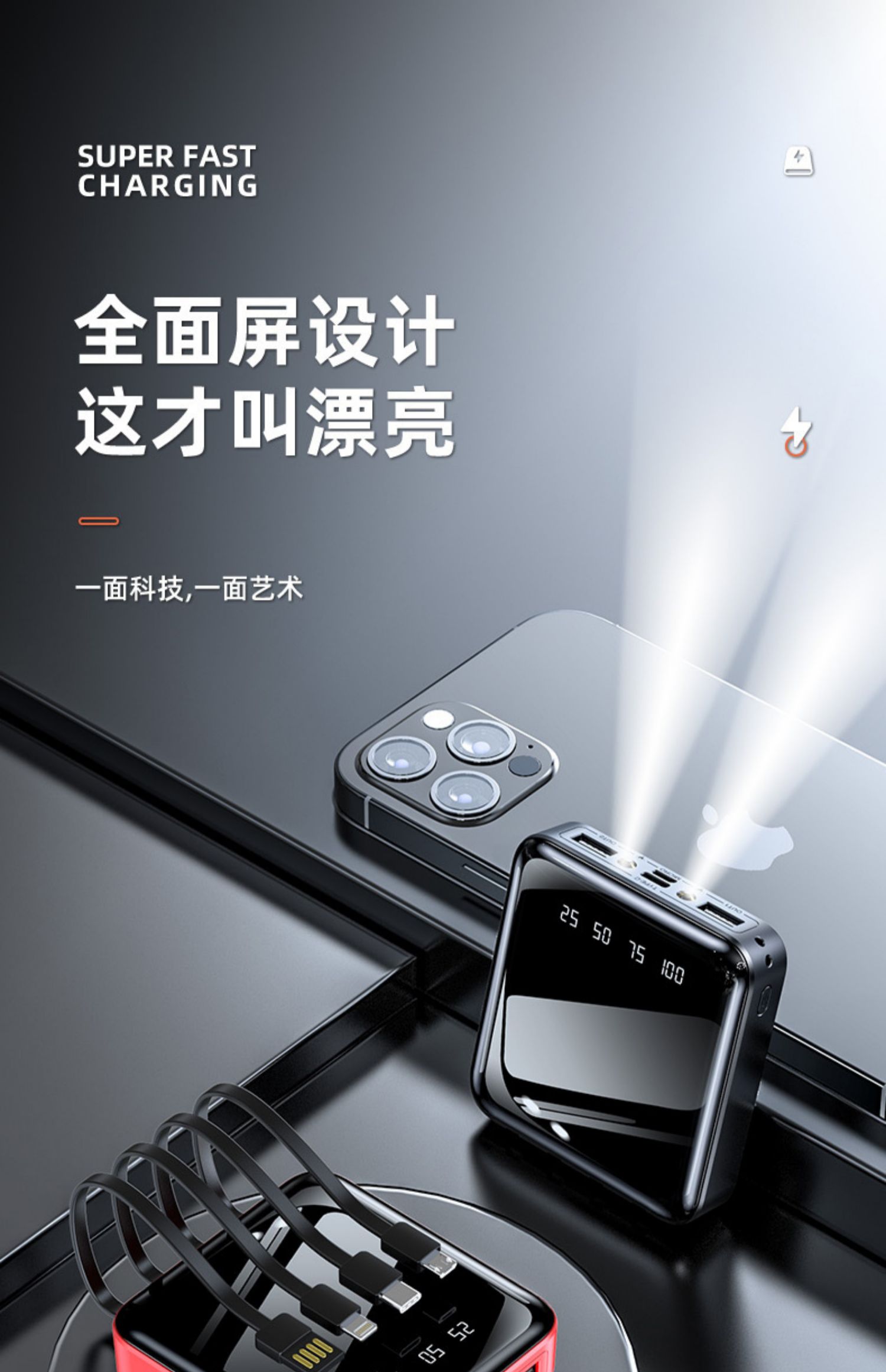 • 商品名称:充电宝20000m超薄小巧便携大容量薄迷你快充手机自带线2万毫安适用华为苹果oppo手机专用1000000M超大量官方
