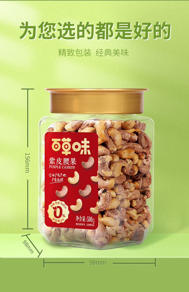 • 商品名称:百草味-罐装紫皮腰果仁500g 盐焗味坚果孕妇零食越南大颗粒年货