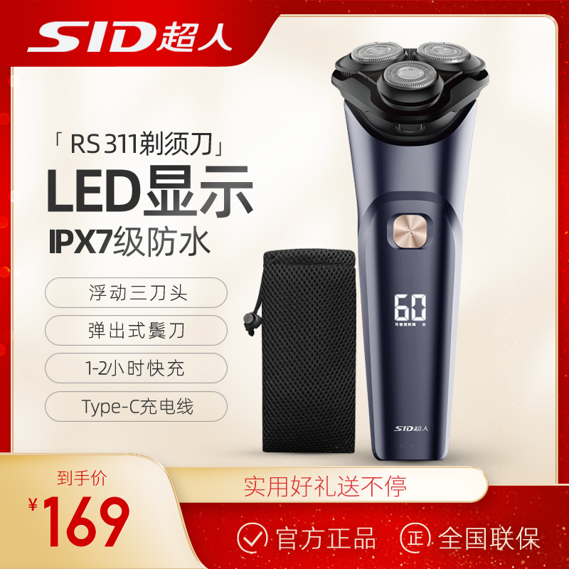 超人RS311剃须刀男士全身水洗大功率浮动三头智能数字显示快充