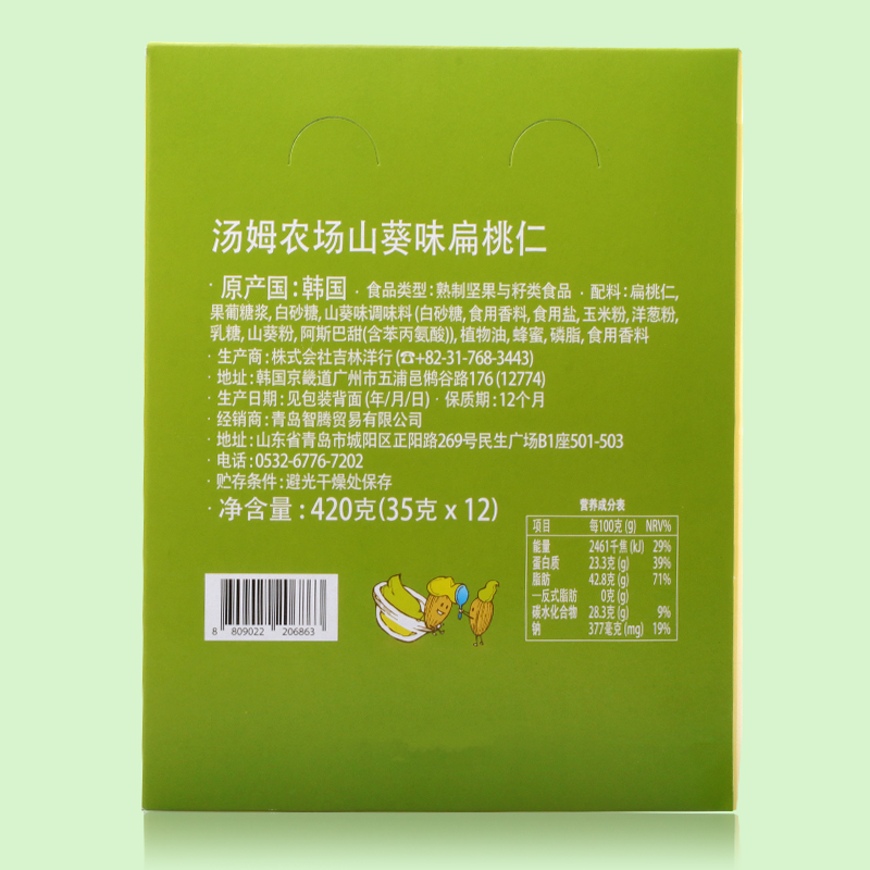 • 商品名称:【进口】韩国汤姆农场坚果零食山葵味扁桃仁盒装12袋芥末味巴旦木