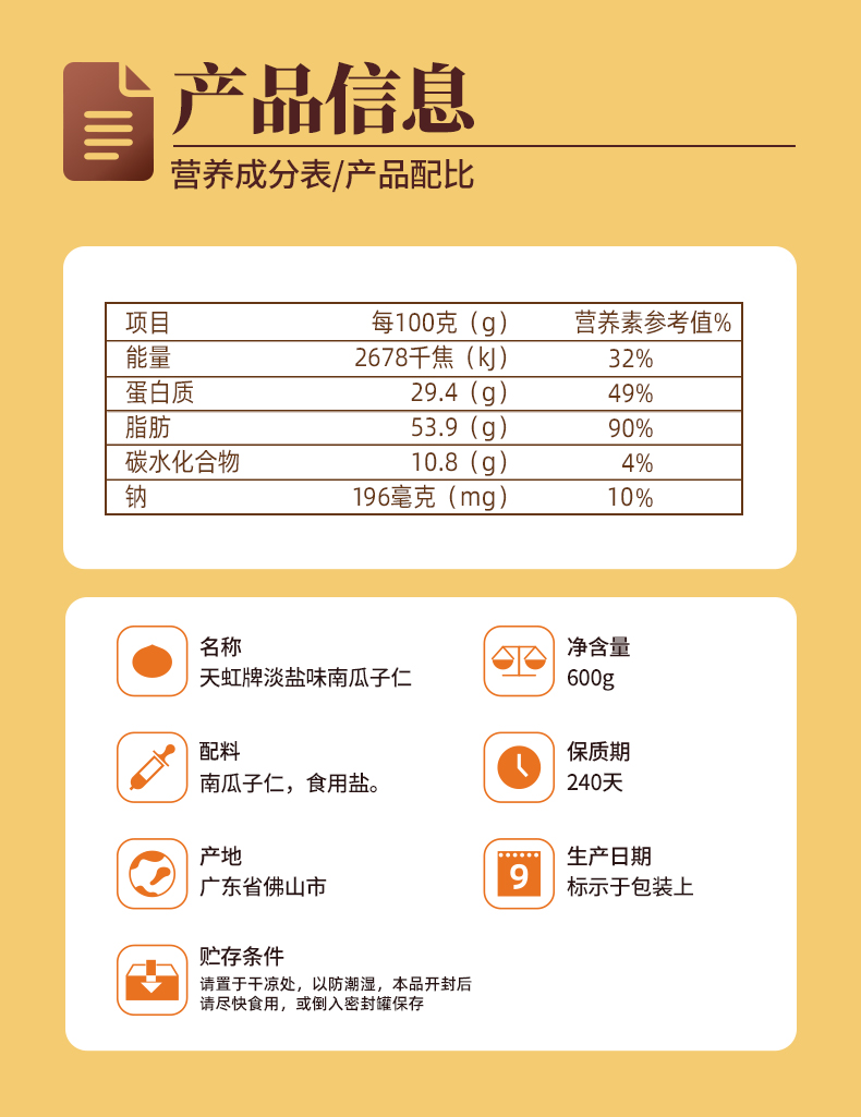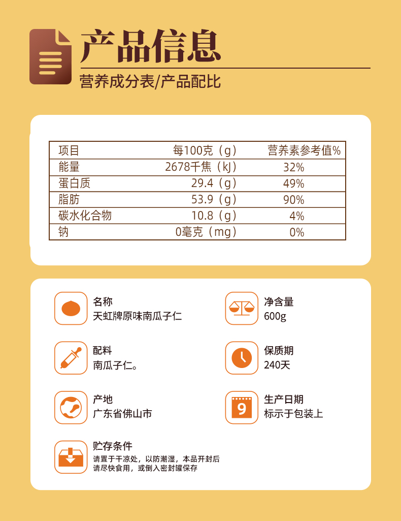 • 商品名称:天虹牌原味熟南瓜子仁500g盒装炒货去壳坚果南瓜籽仁特产零食囤货